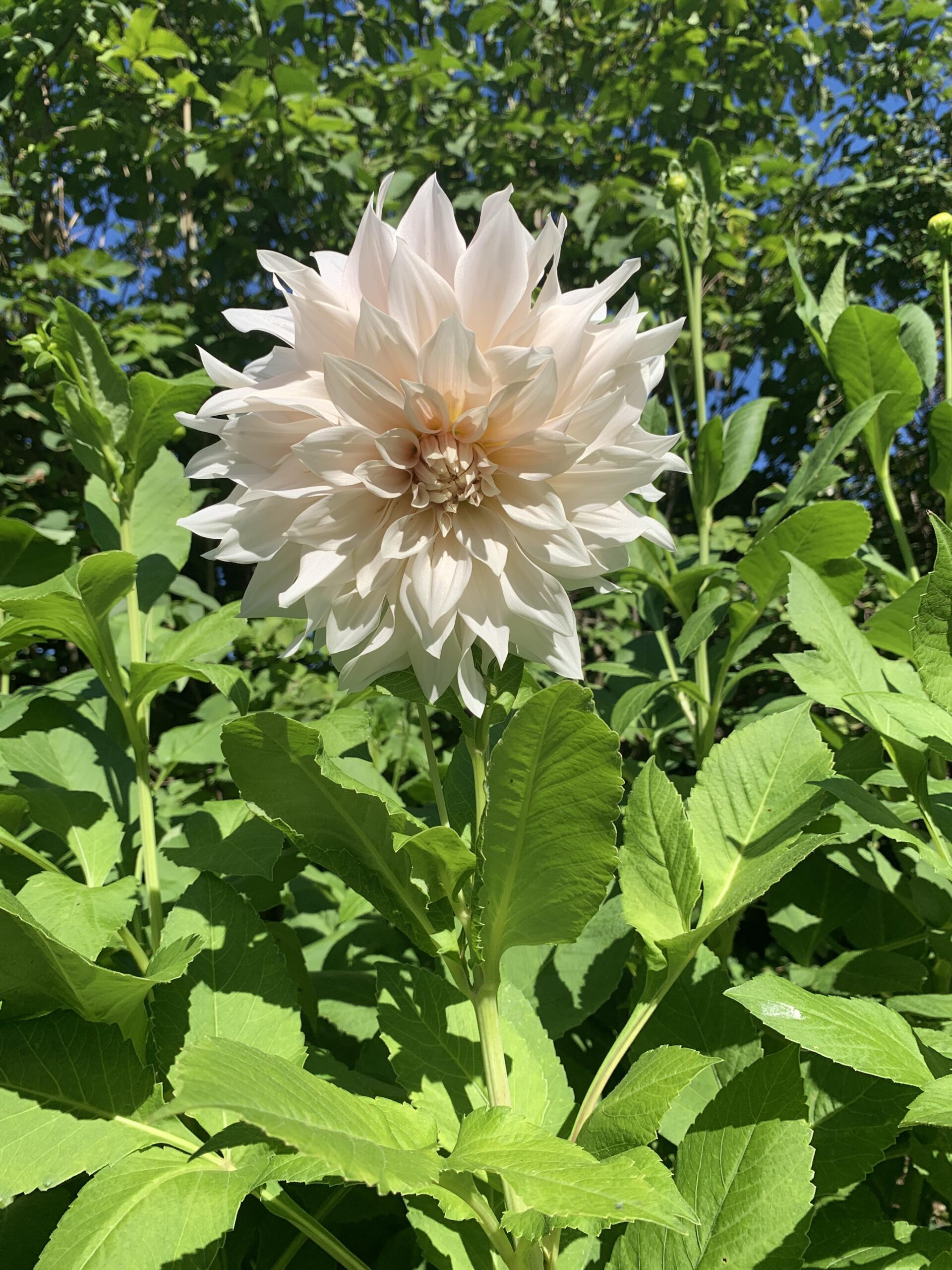 Denne dahlia bliver meget høj! Heldigvis er det en stærk plante, så selvom dahlia generelt ikke bryder sig om blæsevejr, så overlevede den altså nogle heftige stormvejrsperioder i min have midt på Horsnherred – også dem, jeg ikke havde nippet som unge planter. Jeg vil anbefale, du alligevel nipper denne – når du ser 3-4 sæt bladpar, skal du klippe toppen af. Så danner den flere sideskud = flere blomster. Ellers bliver den bare høj og med færre blomster.
