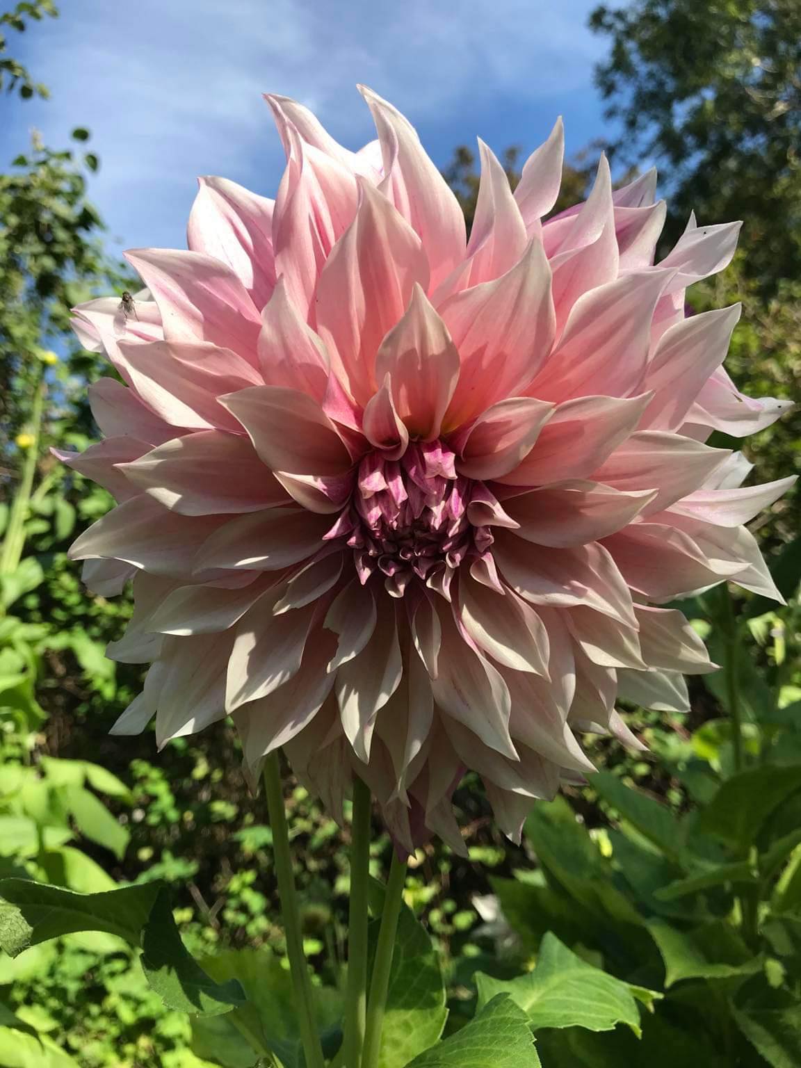 Cafe au Lait Royal dahlia / georgine er en stor dinner-plate variant (blomsterhovederne er på størrelse med en desserttallerken), hvor blomsterne til at begynde med er en cocktail af cremefarvede, lyserøde og pink blomsterblade. Når blomsten får lov at blive siddende, bliver farven lysere, og får generelt en mere blød creme/lyserød nuance. Den er generelt bare smuk i alle stadier!