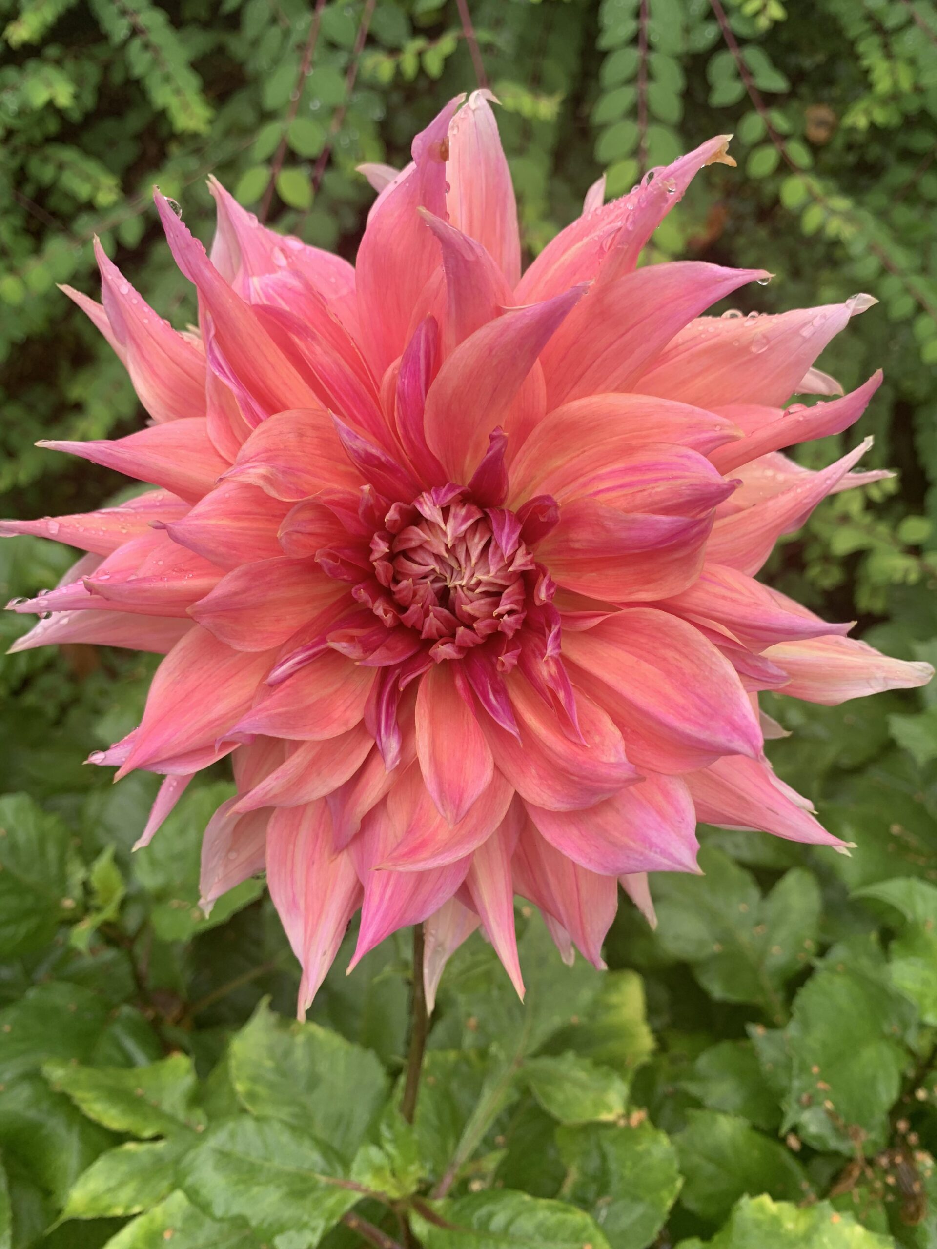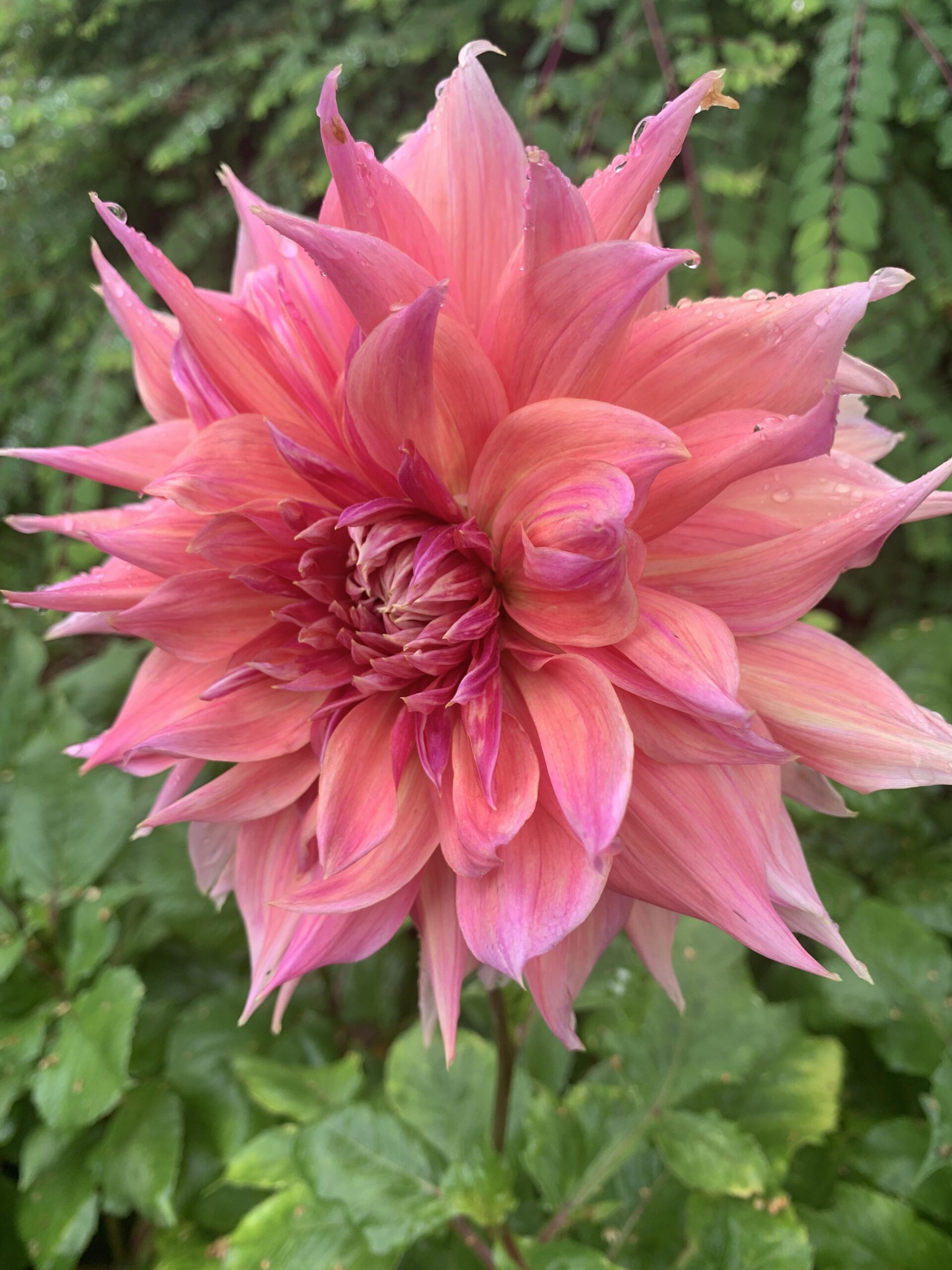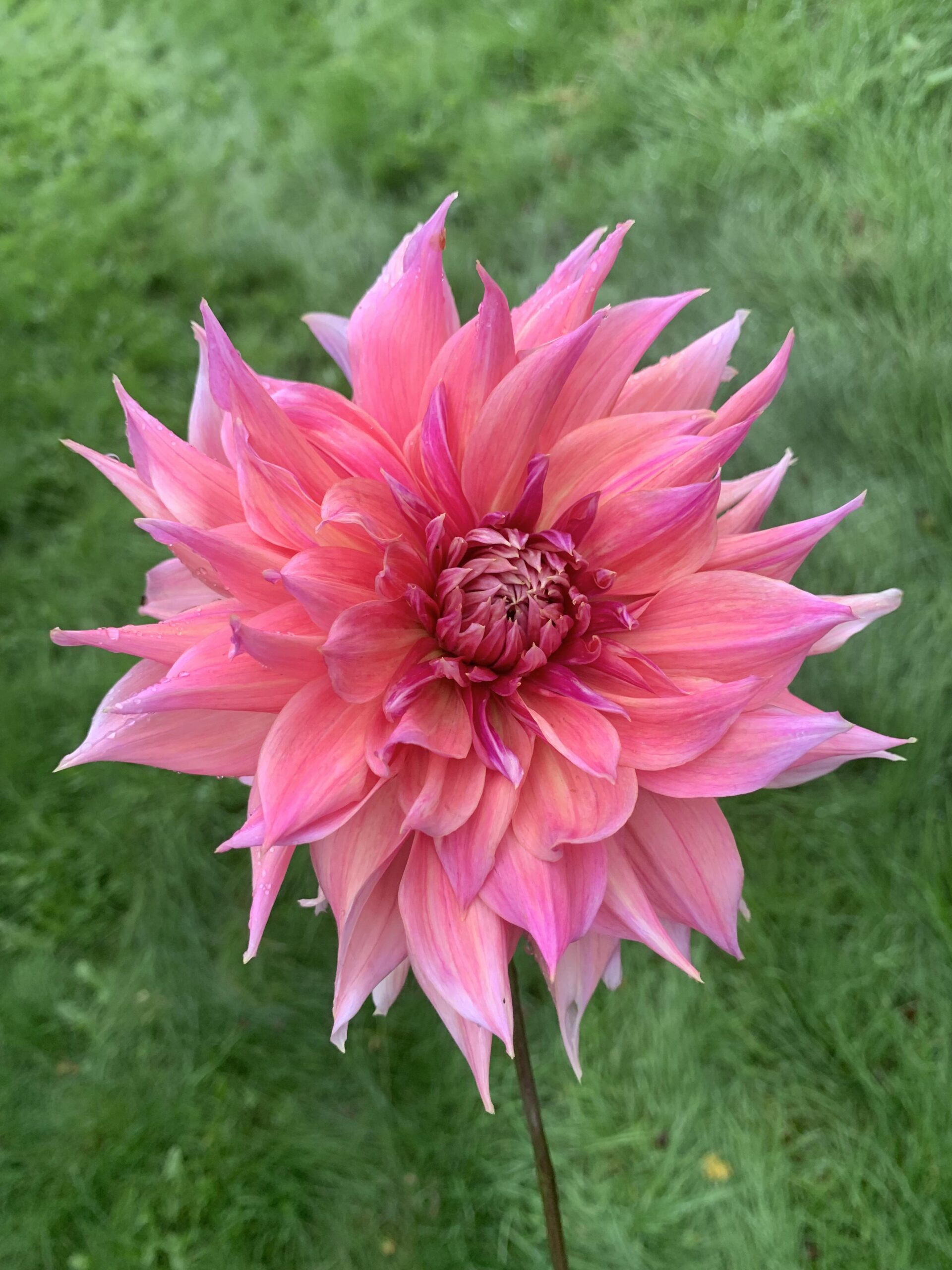 Dinnerplate størrelse dahlia med et skønt farvespil i mørk pink som changerer over i lysere pink og koralpink.